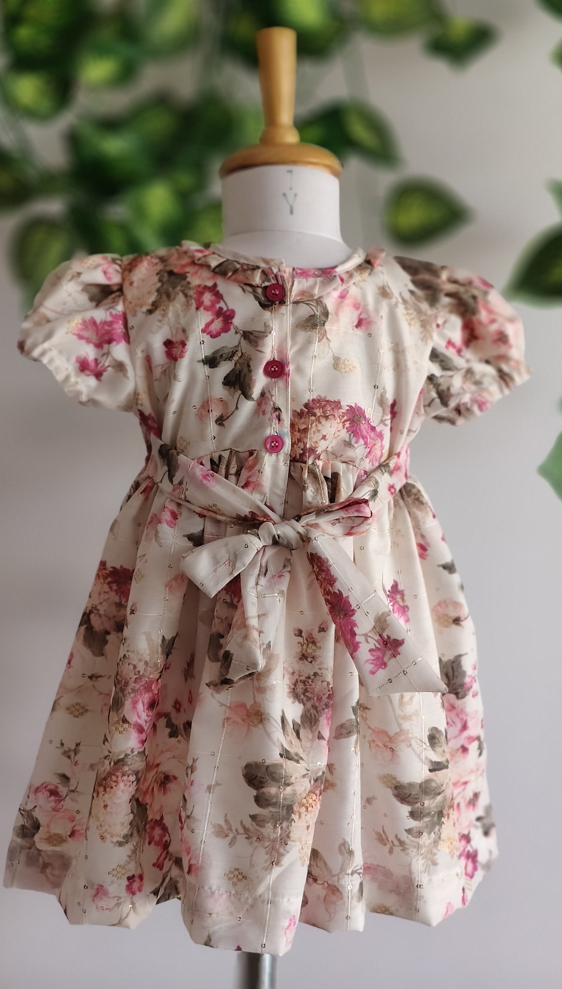 Floral Chanderi Dress with embroidery and sequence design is a flared dress that combines vintage charm, style, and sustainability. Crafted from premium cotton silk fabric, it features a classic frill details